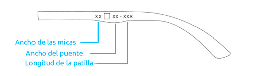 Puedes encontrar fácilmente la medida de tu armazón consultando el interior de las patillas de tus lentes (los brazos). A continuación encontrarás una guía práctica que te ayudará a identificar la talla de tu armazón.