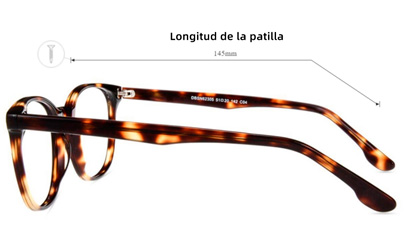c. Longitud de la patilla: El tercer número, 140, describe la longitud de la varilla o la sien. Es la longitud total desde el tornillo hasta la punta de la oreja, que consiste en la longitud de la curva y la longitud del terminal. El tamaño promedio para la mayoría de las personas es alrededor de 140, sin embargo algunos pueden necesitar una longitud de sien más corta o más larga.